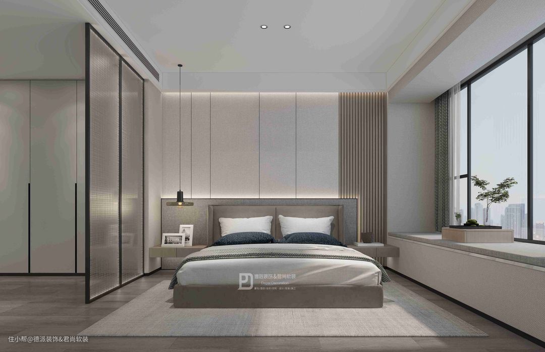 卧室的光感更为充盈,落地造型的玻璃屏风,把衣柜与洗手间做了一个简单隔断,使空间变得更加简洁,营造出柔和的气氛,让人的身心得到放松。
