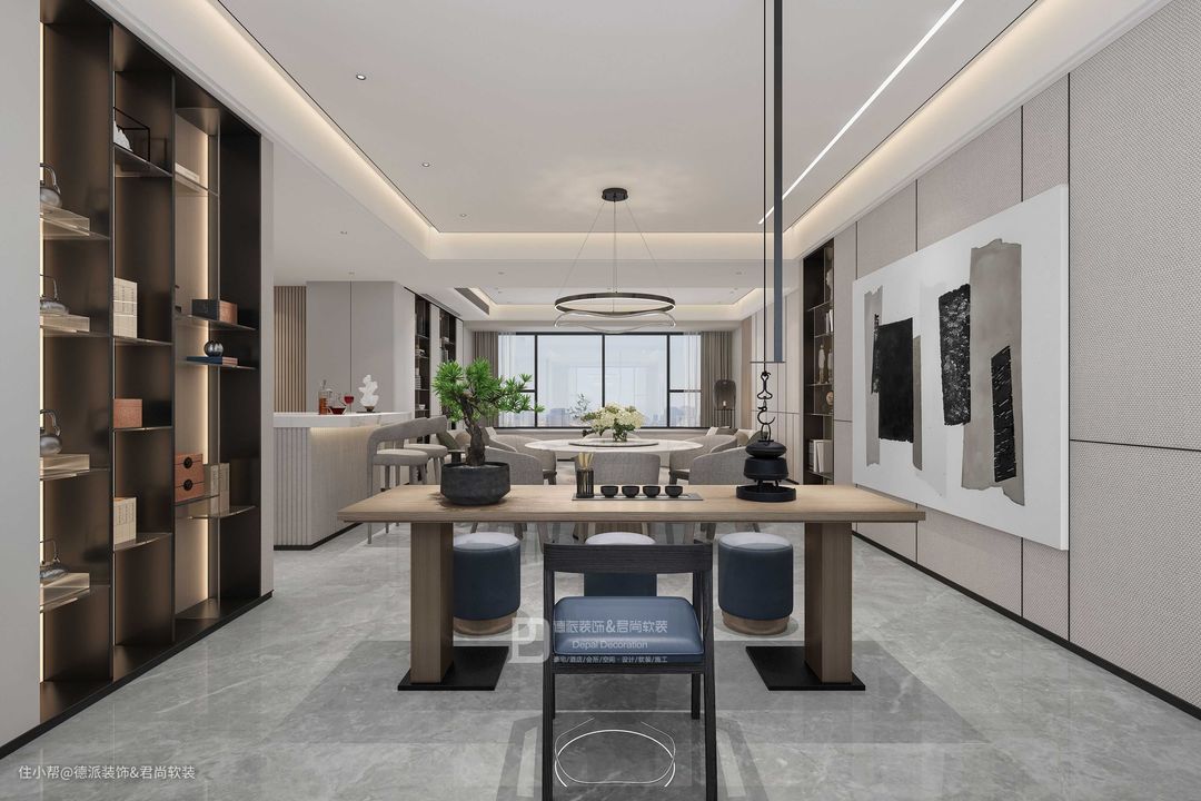 茶室与餐厅在同一个区域,茶室的设计,满足了主人的日常爱好需求,独立的空间,体现出干练简洁之美,收纳式的柜子,可摆放主人喜爱的茶具与饰品,兼具的实用性和美观性,展现主人的高品位与魅力。