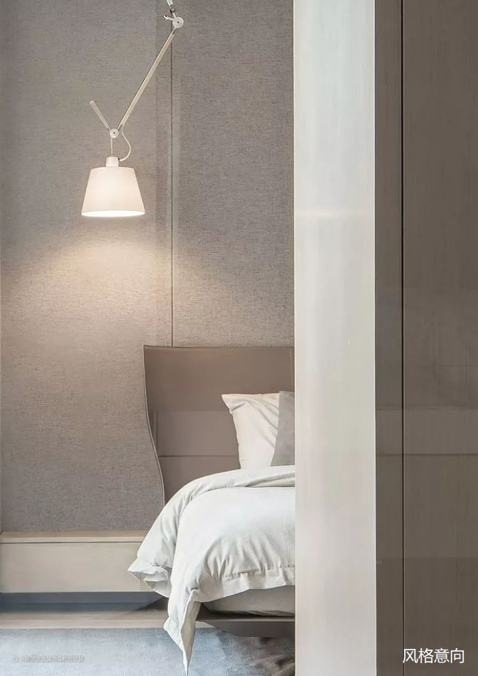 主卧室整体氛围偏向舒适安心,没有多余色彩,只用了白色和适合睡眠的浅灰色进行配合,房间里所有的物品都给人一种渐渐进入睡眠的错觉,让人更快进入休息的一个状态。