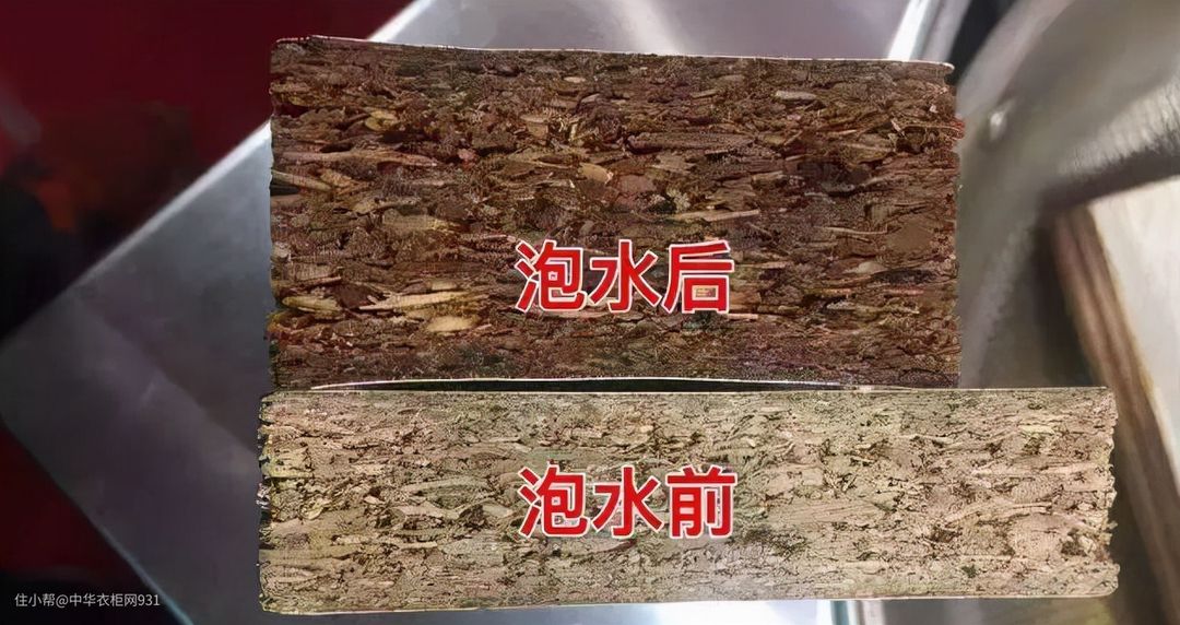 颗粒板的承重力、抗变形能力比较好,但是握钉力差,遇水还会发涨,防水性差