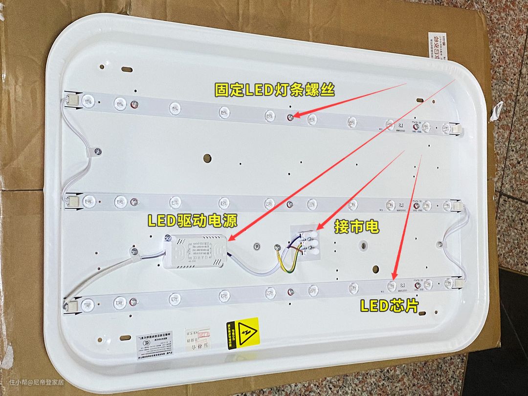 LED吸顶灯大多结构简单,一般都是由灯具底盘、LED芯片、LED驱动电源、灯罩4部分组成,其中LED芯片是发光部件,LED驱动电源简称LED驱动,是负责把220V市电转变为低压电给LED芯片供电。