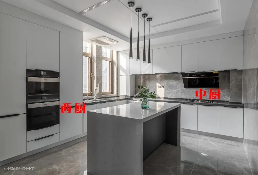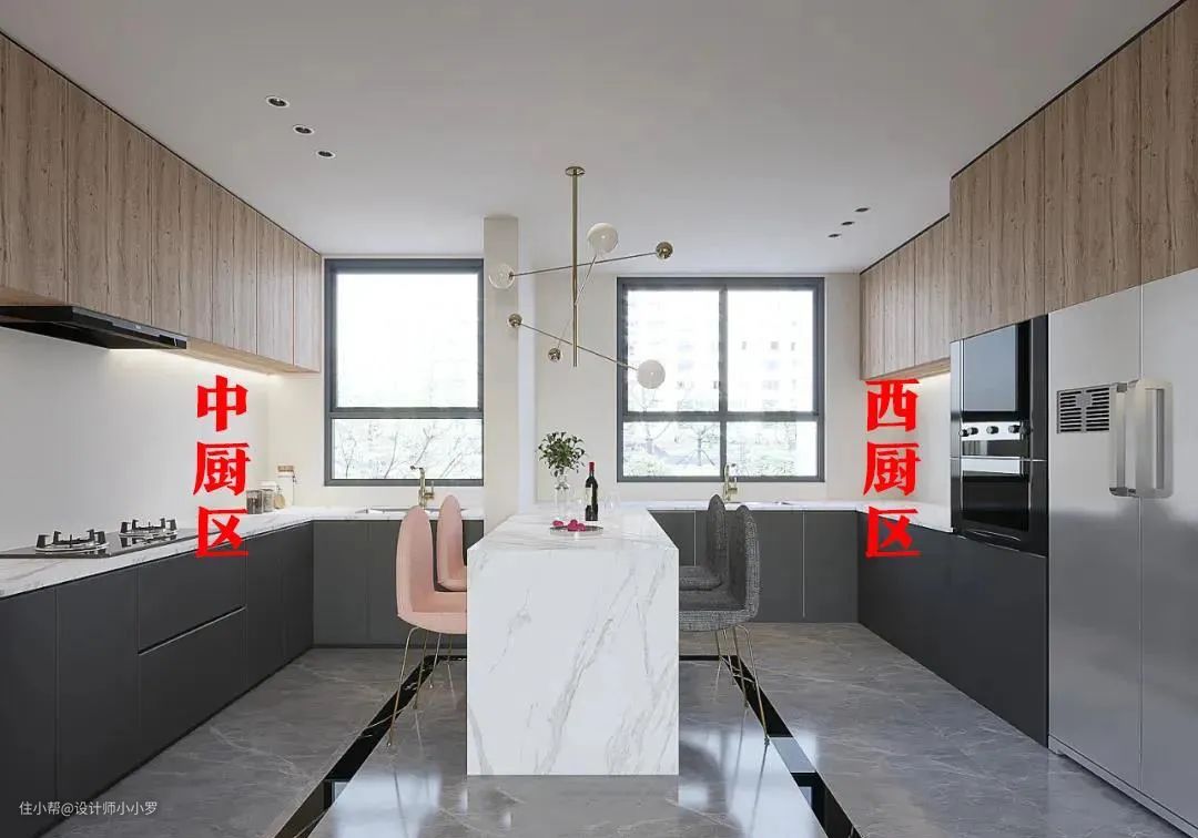 扩大厨房空间,将中西厨放在同一个空间里: