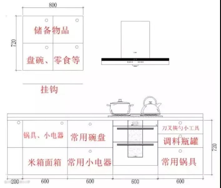 厨房的收纳能力主要看橱柜,所以在橱柜的收纳设计上要注意: