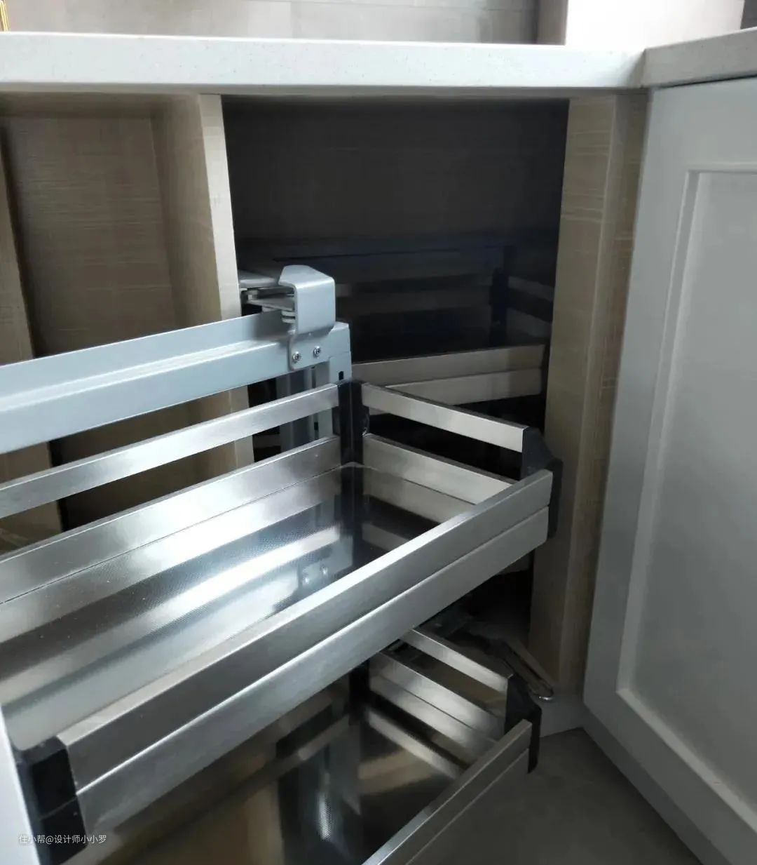 橱柜的转角空间往往比较深,不方便拿取物品,常常是一个收纳死角,如果安装一个转角拉篮,就可以把这部分空间利用起来了: