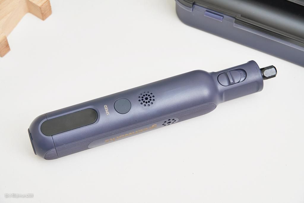这款电磨机外观设计为笔状,机型线条匀称简约,整体配色以蓝紫色为主,长度在19.5cm左右,粗细与螺丝刀手柄差不多,但其内置了8V锂电电池,最大功率可达80W,比市面上同体积的电磨的动力要强劲不少。