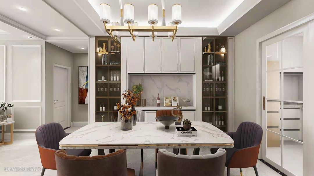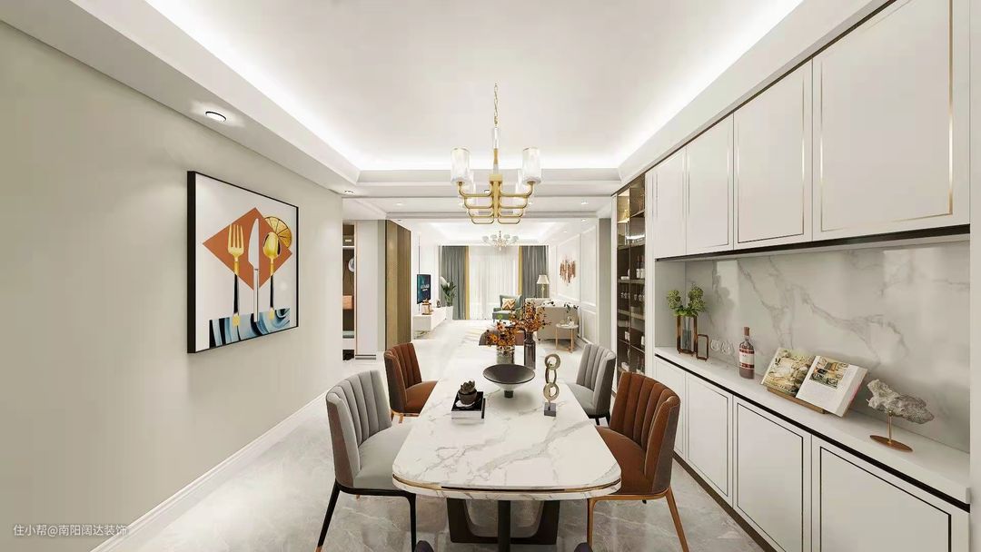 客餐厅作为一日三餐的居家空间,时尚浪漫自然是少不了的,英式气息的典雅酒柜搭配英菲大理石台面的餐桌;一套现代墨褐色布质的桌椅,典雅与时尚的碰撞,无形中给餐厅增添了一种不一样的用餐环境,可谓是相得益彰。
