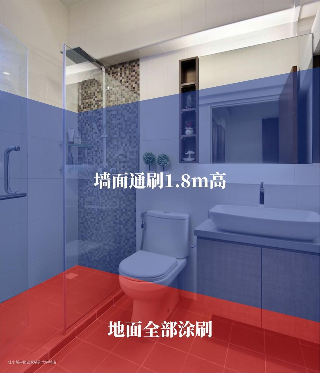 卫生间用水量较大,尤其是洗澡淋浴的时候,水蒸气会附着在砖面渗透进去,所以墙面的防水需要地涂刷到一定的高度。要求工人涂刷墙面防水不低于1.8米,后期基本上不会有太多的问题了。