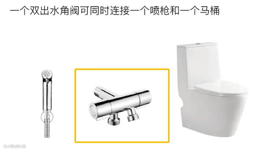 可以使用双出水角阀,一个出水点同时连接喷枪和马桶↓