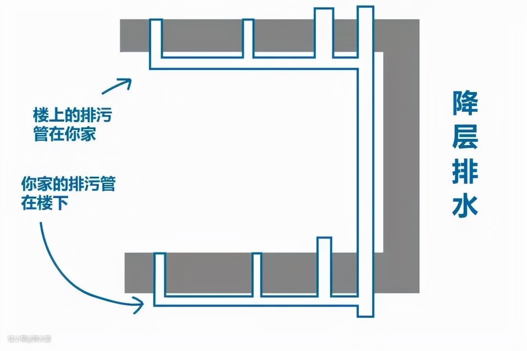 如果你家卫生间和别的地方齐平,只看得到排污管立管,横管都埋在地面以下,这就是降层排水。