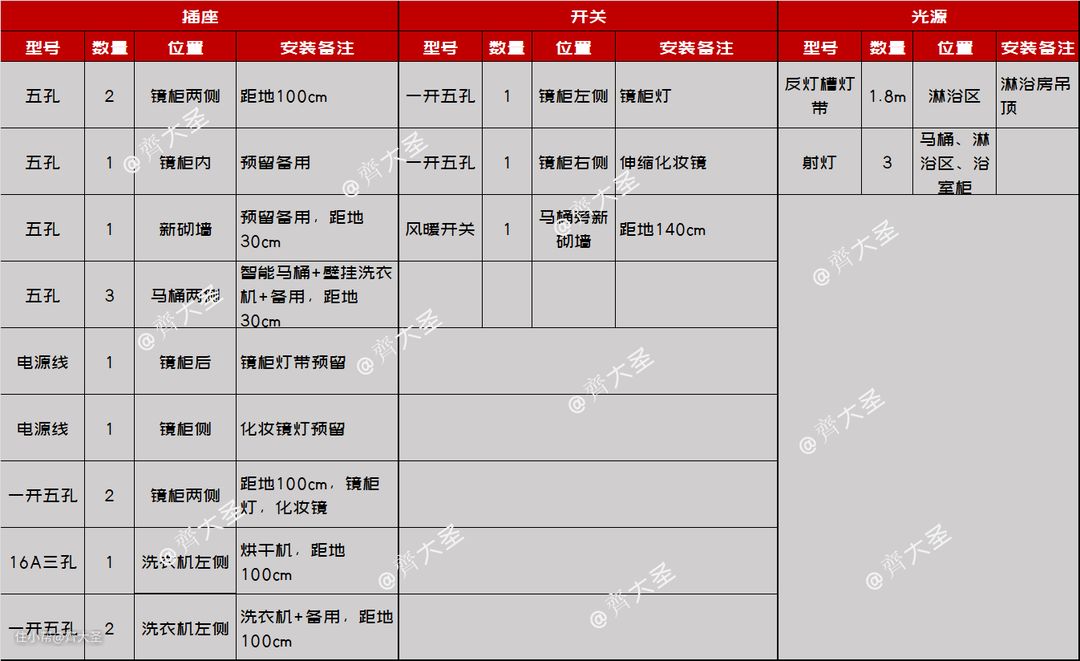 我把我正在装修的这套房子卫生间的电位设计清单直接附上了,供大家参考↓
