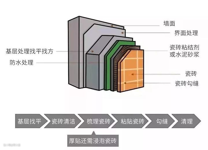 厚贴法:水泥砂浆为主,铺贴厚度大,容易出现空鼓和脱落等问题。(性价比高)