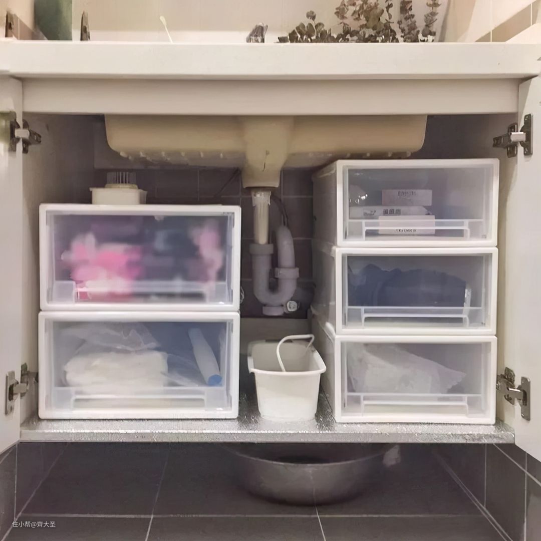 为了减少家务量,浴室柜切忌选择这种有个不大不小间隙的落地式的,简直是又好积灰又不好打扫。卫生间容易积水,落地的家具经常底部发霉,不仅影响美观,而且还加大了清洁工作量。