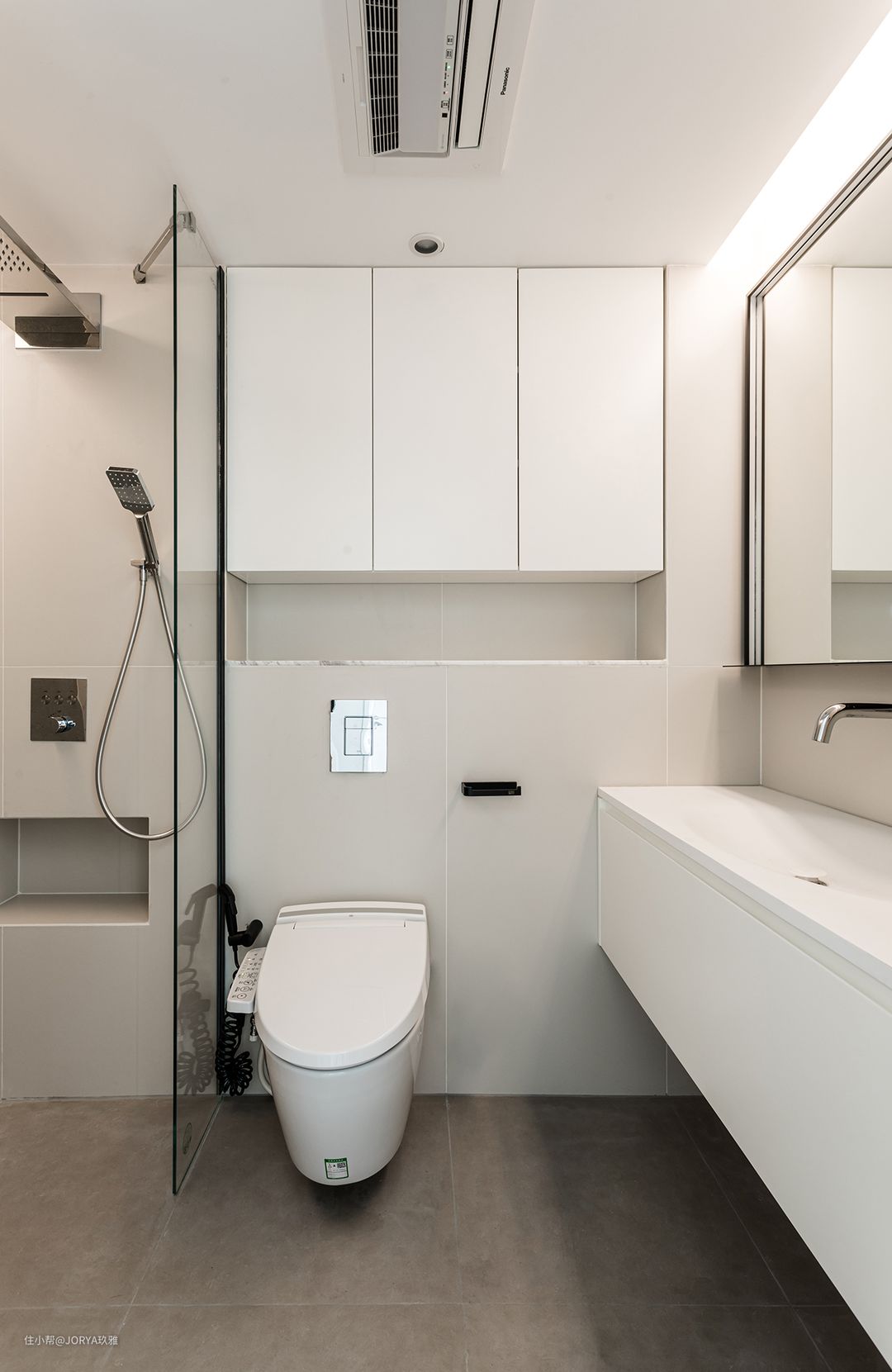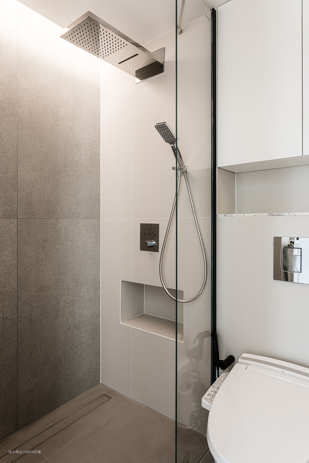 洗手池水龙头、马桶、淋浴花洒均采用了暗装的方式,外观上干净利落。