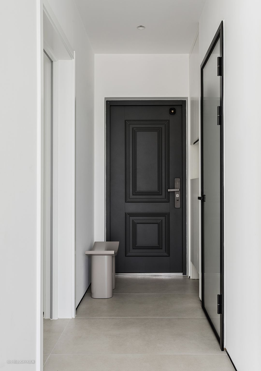 从黑色入户门走进来,可以看到两段式的白色收纳柜、磨砂玻璃门、大块淡灰色水泥砖,色调是清冷的,但质感却很温润。