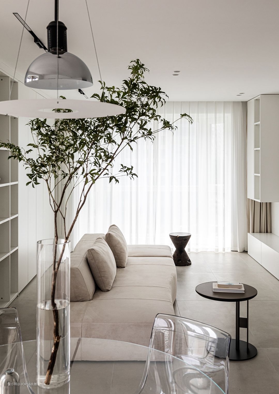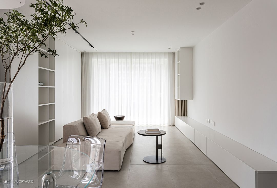 沙发对面是一组地柜+悬挂式收纳柜,白色按压式柜门,没有多余的装饰,完美融入到了整个氛围中。