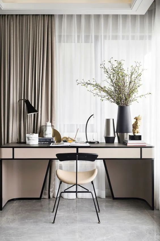如果家里不是很大,那窗前书桌并非是一个不好的选择,相对来说,窗前闲置空间更多,单独放上一张书桌,也能更好的利用起来,尤其是整面落地窗前,不能打柜子,但放书桌既不会影响室内采光,也新增加了一个功能区。