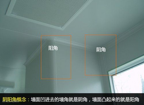 房子的阳角就是从室外看房子的一个角,即向外凸出的墙角。房子的阴角就是从室内看房子的一个角,即向内凹进去的墙角。