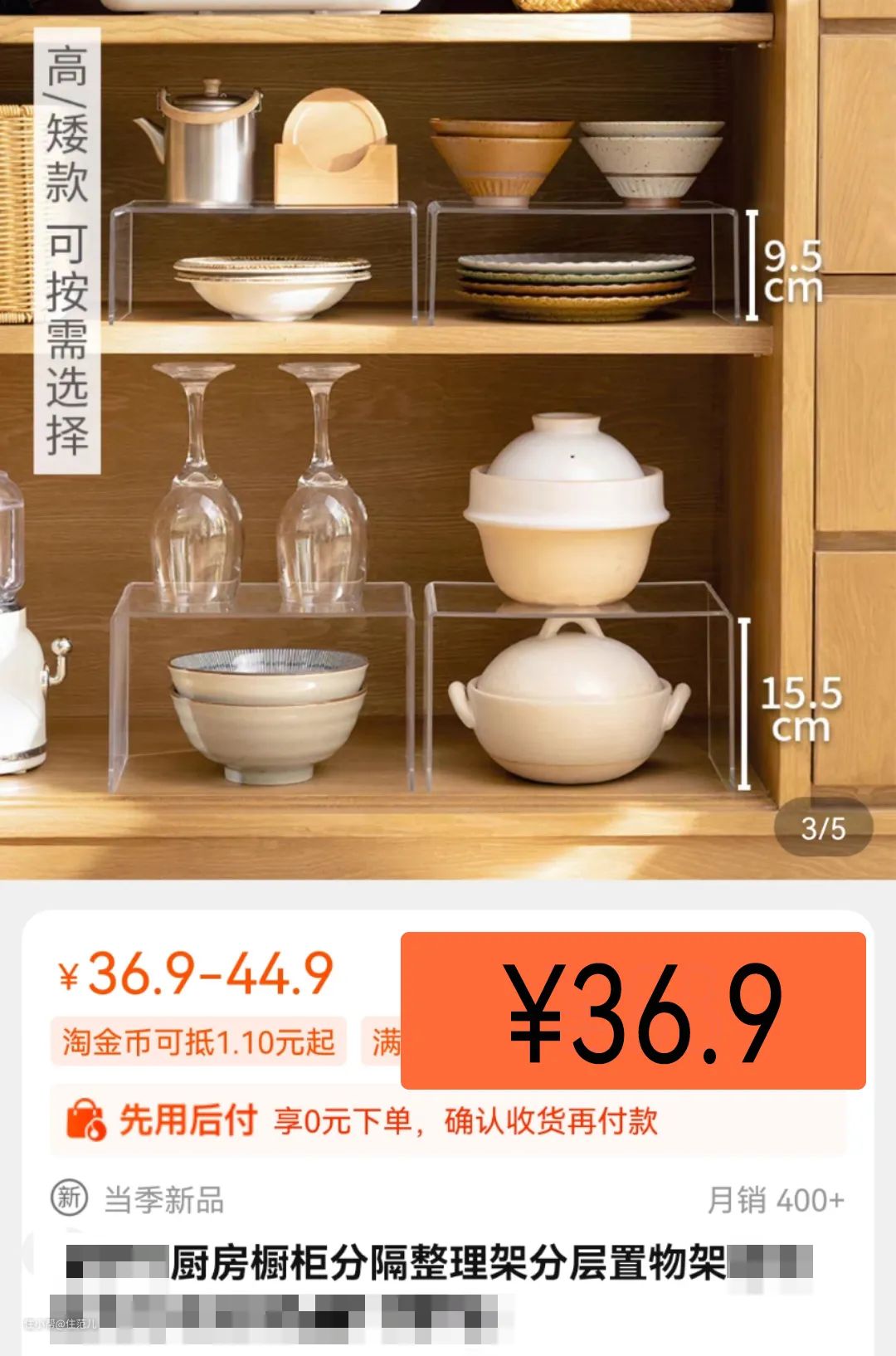 如果定制柜的开放格设计不够合理,买亚克力展示架,用作橱柜分隔是很不错的方法,增加垂直收纳空间,足够通透质感也不错。