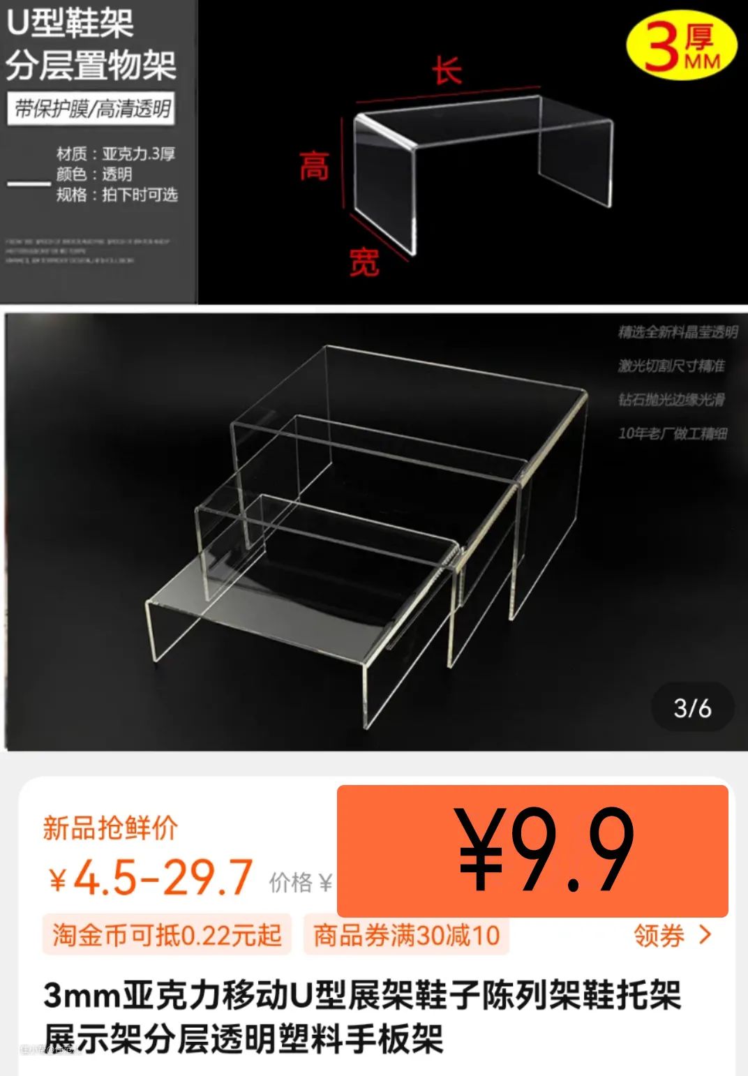 但你别急着下手,淘宝搜“亚克力鞋托”,你会看到几乎一模一样的东西,价格就少了好几十倍