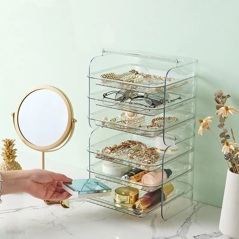 6层的备菜盘,价格才60元,抽屉式设计,分类叠放是基础操作,常见用法是备餐、火锅、果盘和放在冰箱存放,谁能想到装化妆品也是一把好手。