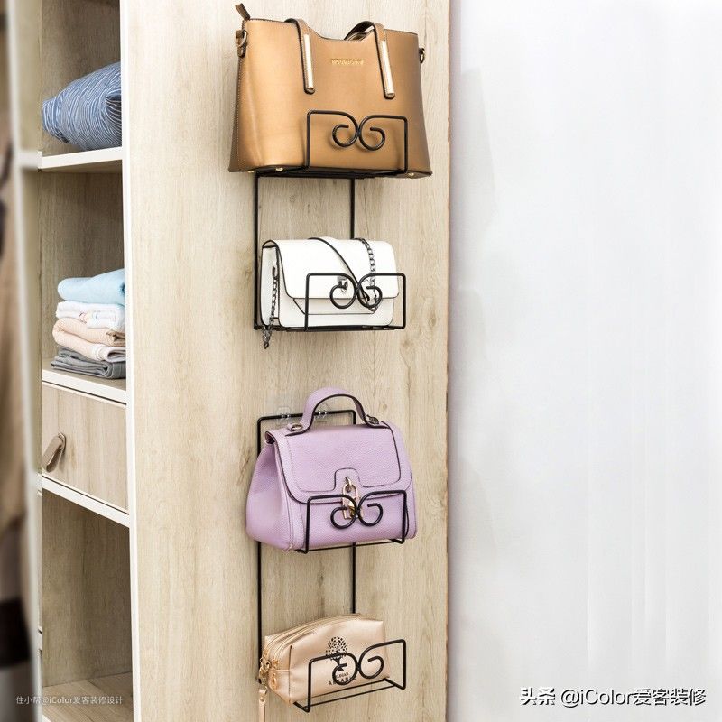如果是常用的包包,可以用这种铁艺架子,把包包挂在柜子外侧,拿取很方便。