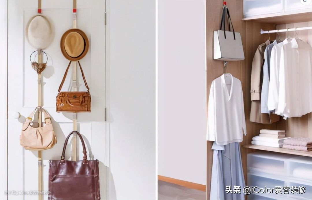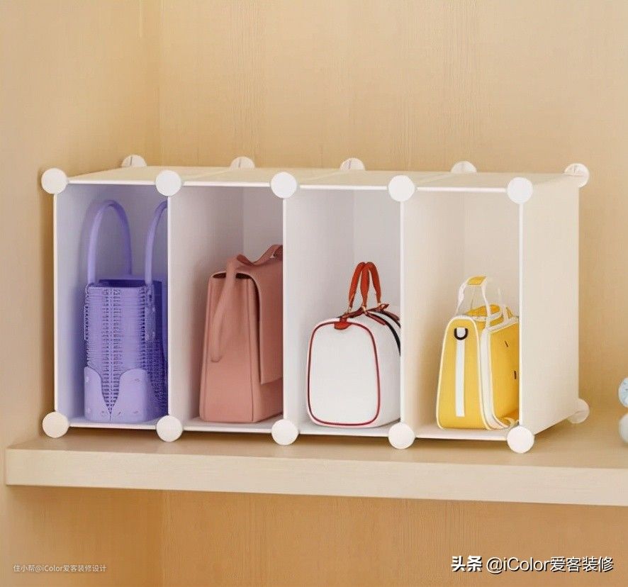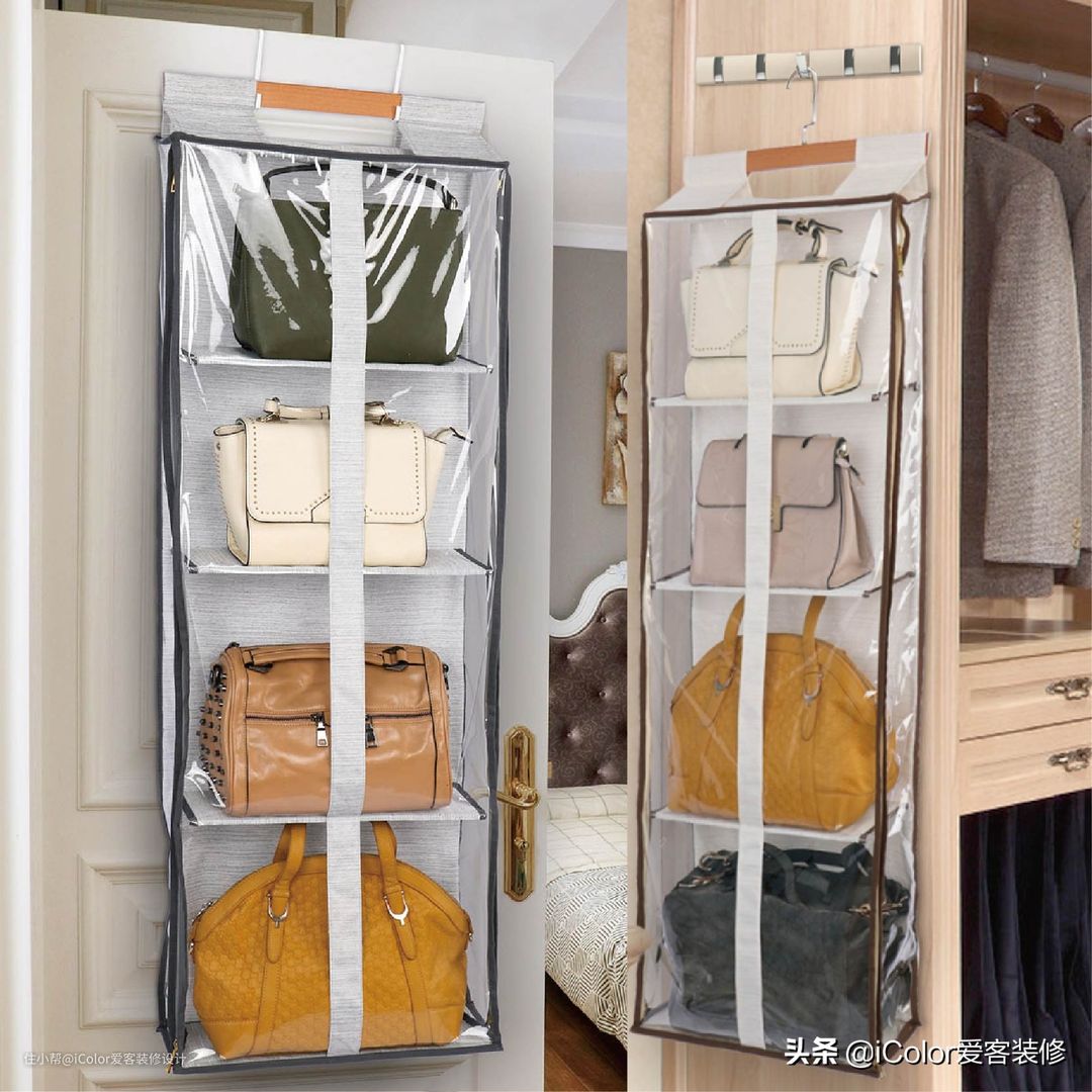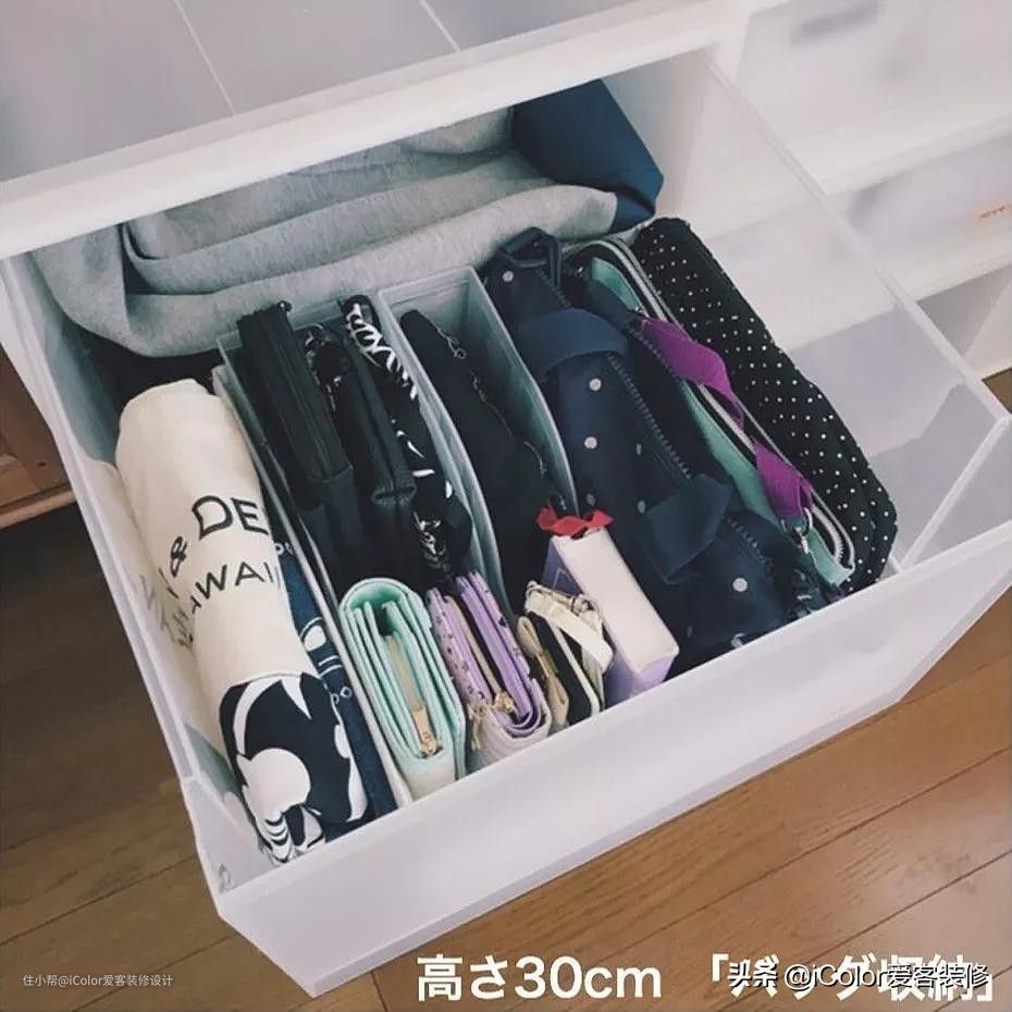 包包要放在显眼的地方,以防用着用着就找不到了,比如衣柜最上层的隔板,就是用来放包的。永远遵循一原则:经常使用的物品要收纳在使用的动线上。