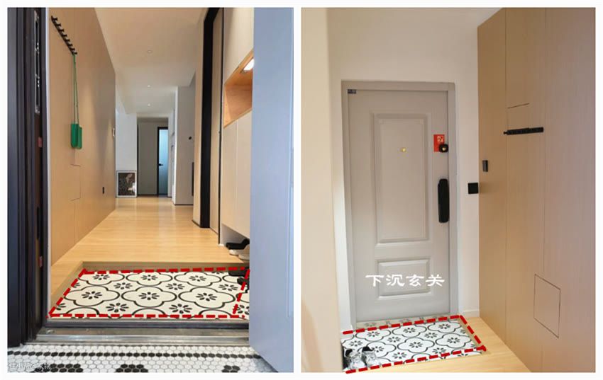 既然没有足够的层高,不妨将下沉的高度缩减到4-5公分,这样的高度,不容易被绊倒,也足够作为换鞋区和落灰区了。