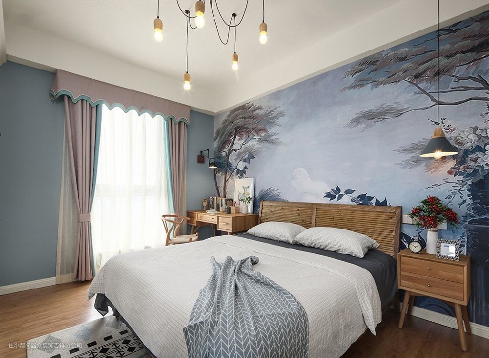 如果觉得刷纯色的墙漆太单调,不妨试试创意彩绘,会给你绝对的惊喜!彩绘图案可以根据自己的喜好选择,甚至是个性化定制的绘图,不仅创意十足,还带着满满艺术感,绝对独一无二的设计,在卧室里呈现赏心悦目的风景。注意:选择专业的彩绘师是关键哦。