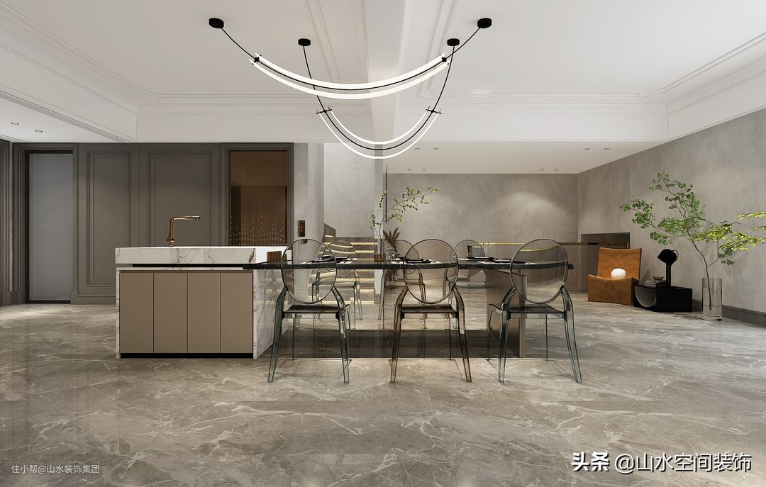 一套320㎡的独栋别墅空间,设计师以精炼的布局手法,打造出轻奢有度的宽敞空间,主卧带衣帽间的配套设计、岛台式的休闲区,不同的空间都被赋予了更多的功能表现。大理石、长虹玻璃、金属等不同材质在空间内交织融合,以轻奢风的高级与精致描绘出生活空间的格调与品质,迎合了居者对高品质审美的追求。