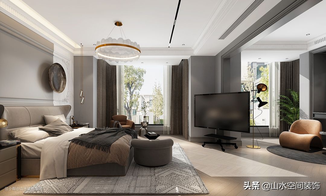 套房式布局的主卧,给了屋主足够的私域空间。灰色与大地色交织,所以的设计均围绕着舒适展开,鱼骨拼地板、地毯、床品、沙发椅等等,软装上的搭配柔软舒适,可移动的电视设计更显人性化。