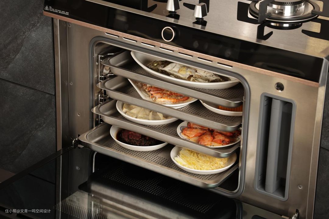 像我平时工作忙,如果不想做饭,就可以用蒸箱蒸一些馒头、花卷之类的速冻食品,想做饭的时候,就可以在上面烧着菜、炖着汤,蒸烤箱还能拿来蒸鱼、烤串,告别不健康的外卖生活。