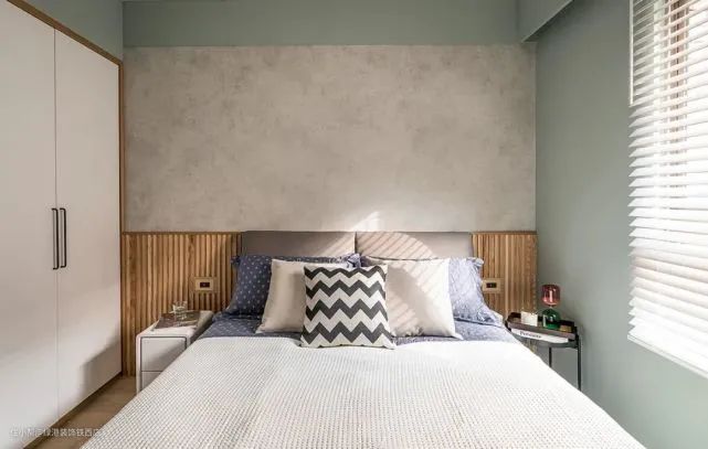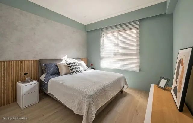 灰绿色作为次卧墙面的主色调,床头木格栅搭配配灰色特殊涂料,营造略带日式禅风的质感。简单舒服的配色让客房成友人来访时,舒适的睡眠场域。