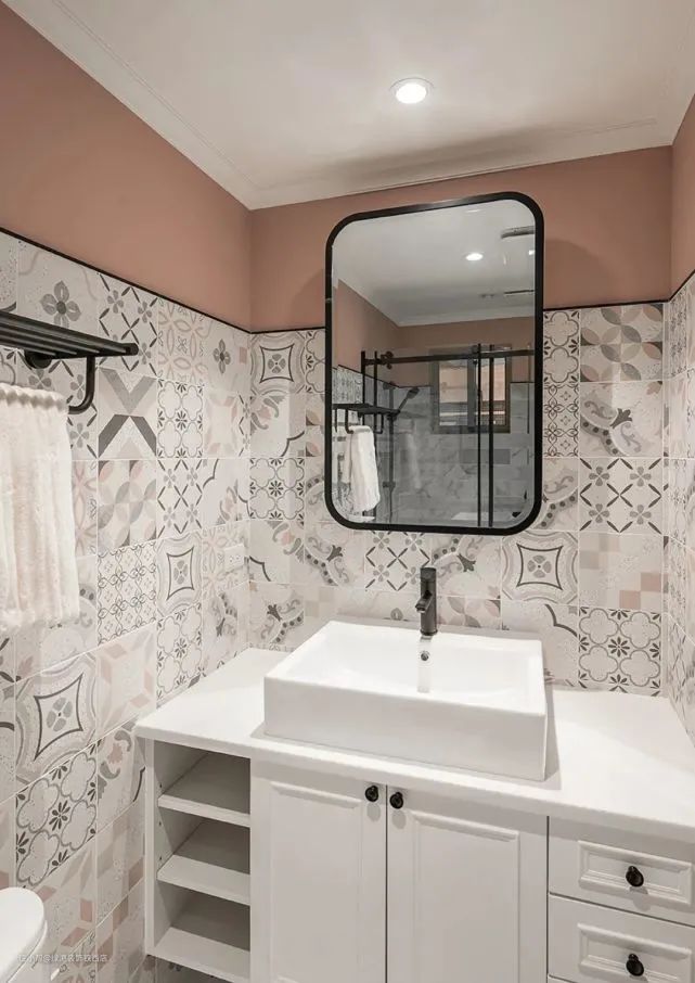 主卫入门右侧利用墙面规划柜体,可收纳脏衣或小物品。纯白简约的卫浴柜体,凸显花砖活泼图样。延续主卧房粉色,画出靠天花板处的色块线条,其余铺上欧风感壁砖,以1比9视觉比例区分色块和壁砖领域,视觉多些活泼调性。