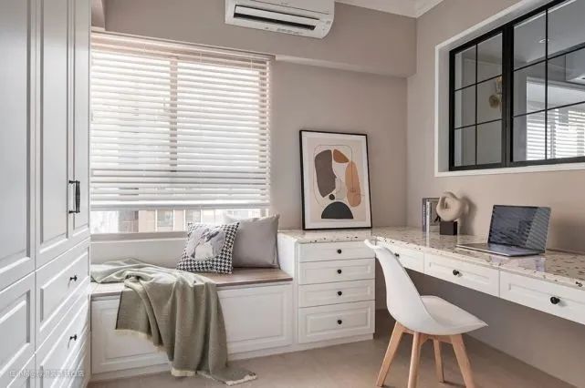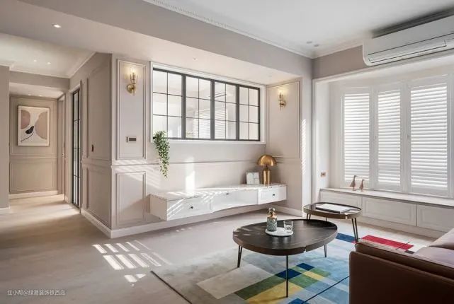 客厅的窗户占据了一整个墙面,采光极好,为了延续优点,更换全新铝门窗后配白色木百页扇,可视需求调整日光引进多少。靠窗处有卧榻隐含收纳空间,家人访客较多时,无需担心座位不够。