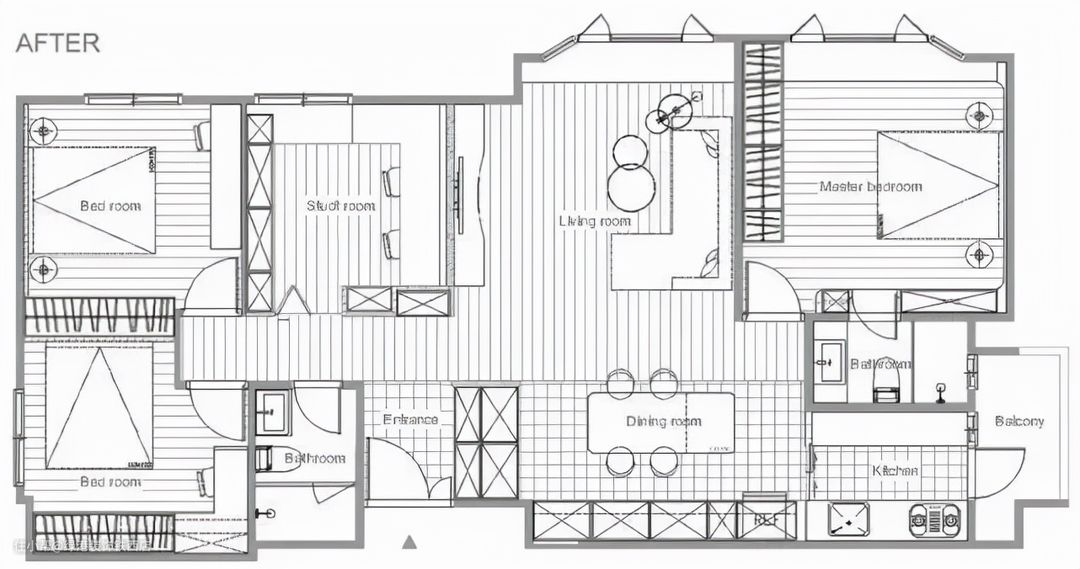 玄关和餐厅相连壁面的收纳柜,内凹台面收纳进出常用小物,小吧台餐桌后方收纳占据整个墙面,延伸到和玄关相连处,形成一个L型收纳空间。每个房间设大面积衣柜,书房和房间靠窗处卧榻下方也有收纳机能。