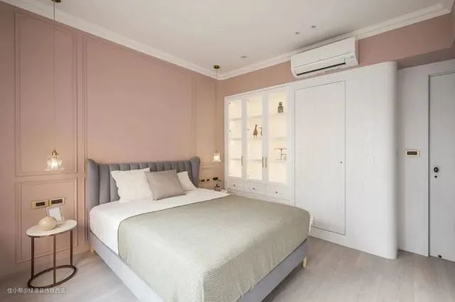 主卧略带粉色,床头背景墙用线框装饰,带出空间层次感,床头靠背做了弧形设计让线条更为柔和,更具有延展性,同时床头两侧摆放小尺寸圆桌,取代床头柜更具有都市现代感。为了让卧房的粉色具视觉层次,床头板以倒圆角柔化表面,摆放小尺寸圆桌取代床头柜,桌脚带些现代感。