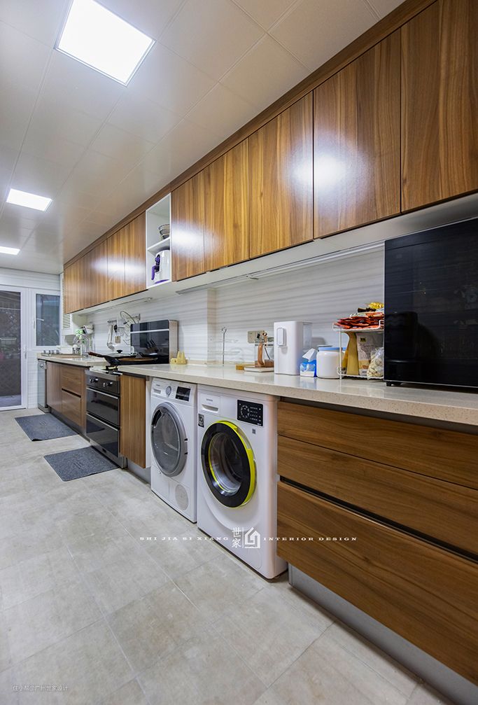 (2)功能分区明确:利用转角把厨房划分为两个垂直的长形区域,两处功能不同,各自工作,一转身就可以到另一处进行操作,也非常方便。