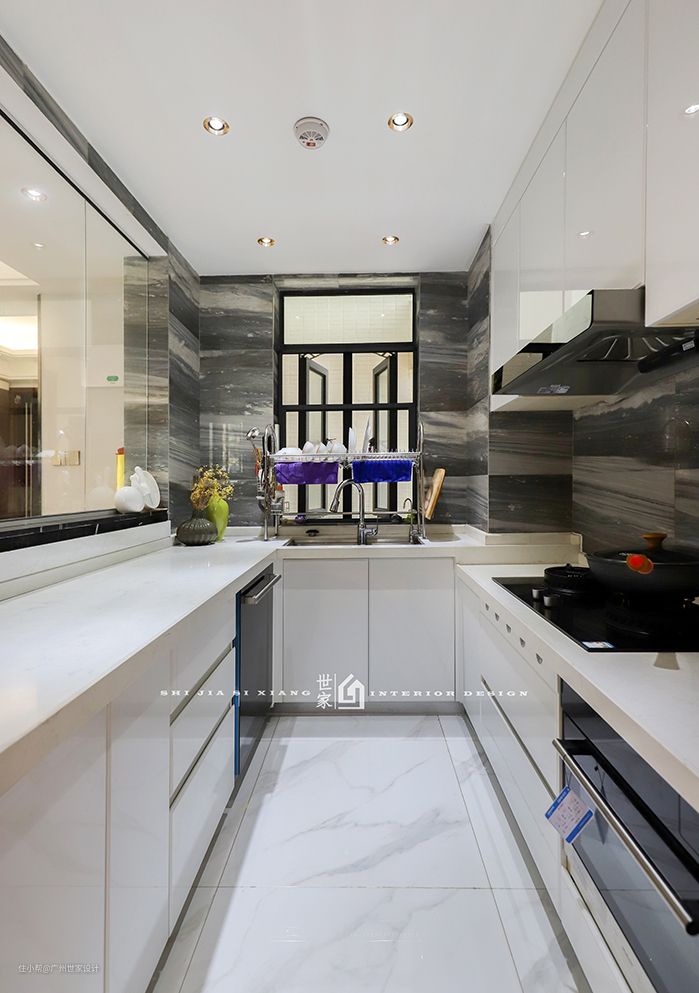 (4)储物功能强:“U型”厨房是储物功能最强的,上有大空间的吊柜,下有“U型”橱柜,放下厨房一应用具不成问题,这样能让厨房表面看起来干净整洁。