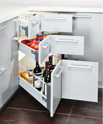 (1)转角使用盲区:橱柜做成了“L型”,转角的地方还是一个直角,因此不能同时打开转角区域的两扇柜门,相对“一字型”来说没那么方便。不过现在有很多设计采用转角拉篮的方式解决这一问题,但是价格会比较高,斟酌选购。