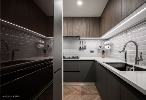 厨房的照明以实用为主,主灯一般选择吸顶灯,也可以选择与铝扣板吊顶配套的照明灯。但是单一的主灯容易形成阴影,特别是备菜的时候,局部照明不足。这时候可以考虑在备菜区的墙面安装局部光源,灯带、射灯等都可以选择。