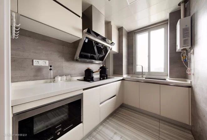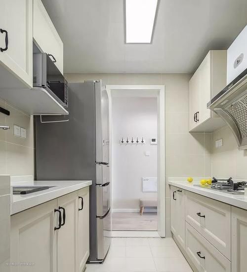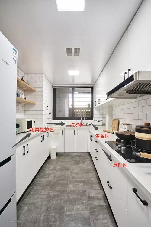 小tip:这种厨房布局对厨房的宽度有硬性要求,走廊的宽度不能低于1m,最佳为1.2m以上。如果两边橱柜相隔太近,会导致橱柜柜门难以完全同时打开,通行的时候也会非常拥挤。
