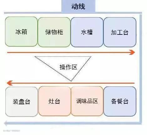 举个简单的例子来说,一个人进厨房最先到达的是冰箱的位置,冰箱旁边是备餐、调味摆放区,再走过去就到了烹饪区(灶台),然后厨房的尽头是水槽洗涤区,这一系列的位移就是一条动线。