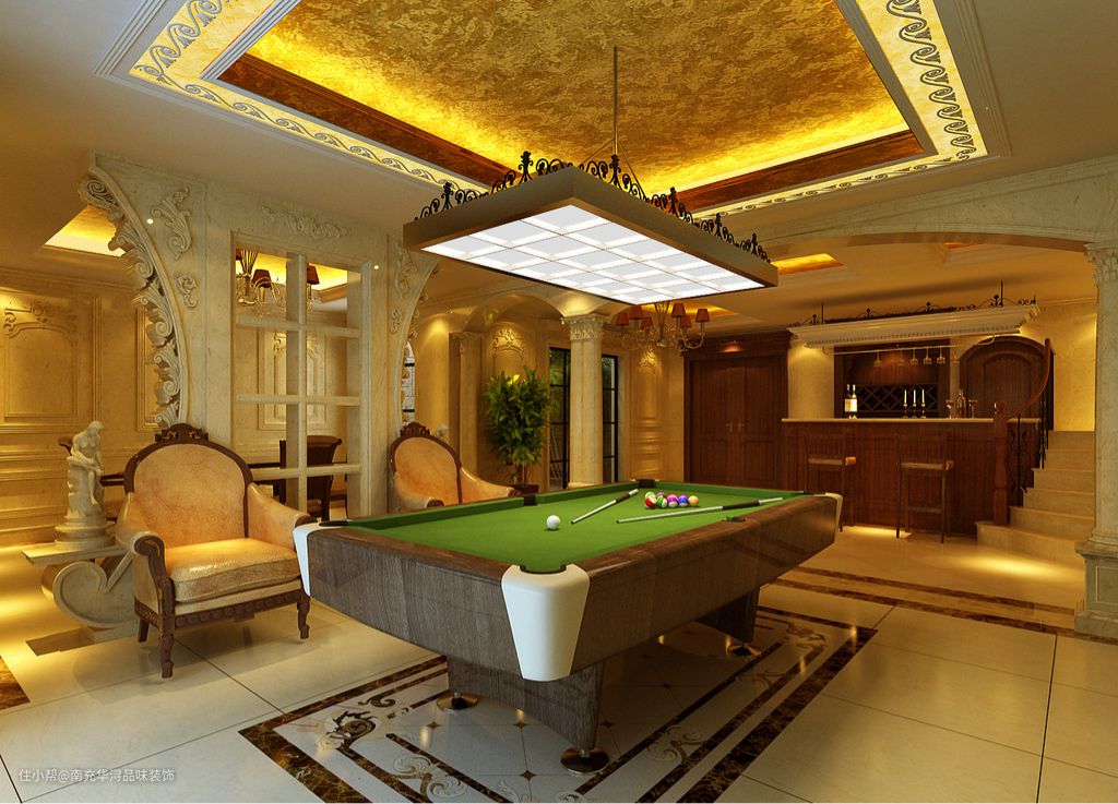 饭后的休闲娱乐是现代社会必不可少的活动,台球室是一个很好的选择,台球室的设计不需要花费大成本,一张台球桌,创意氛围灯,空间搭配——完美。