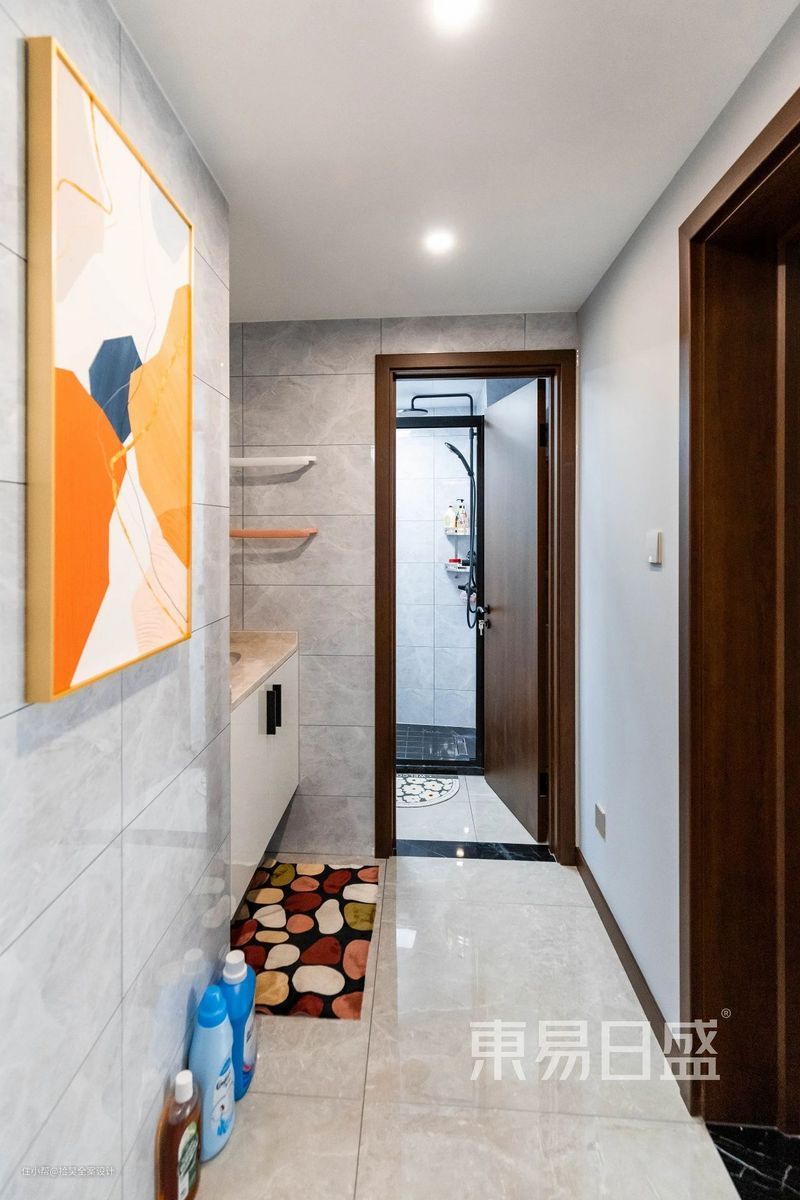 卫生间借用过道的空间做了干湿分离,扩大了空间,同时也增加了储物功能。
