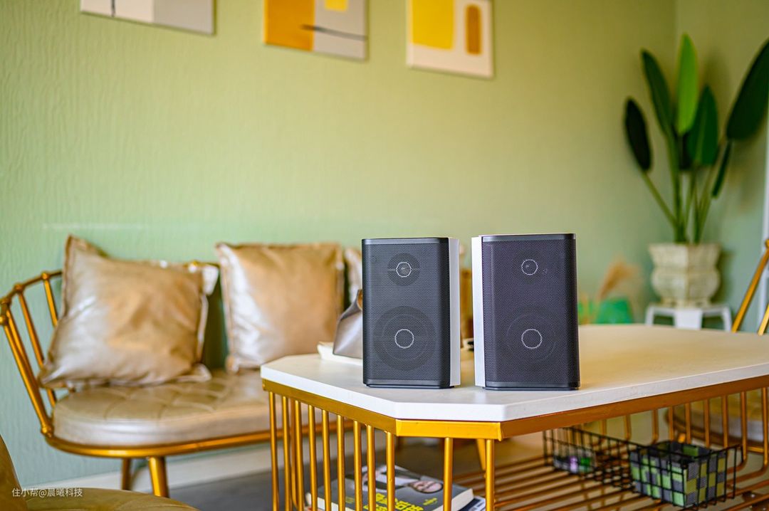比如这个环绕音箱,造型十分前卫,融合了多边形和流行的撞色元素,整体风格精巧现代,透过金属网罩可看到内部的3英寸全频喇叭1英寸高频喇叭。