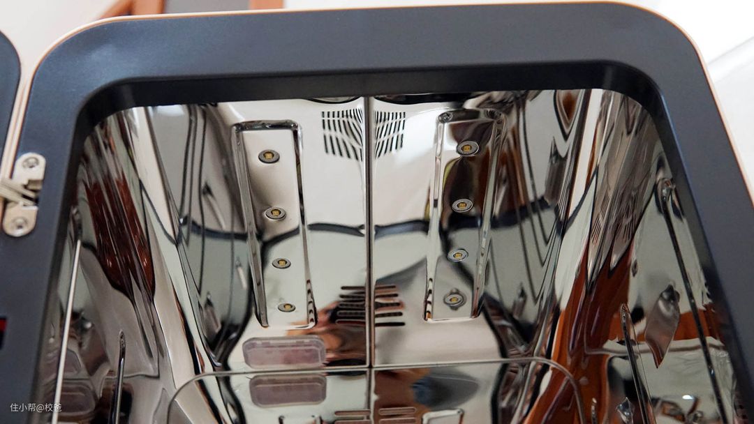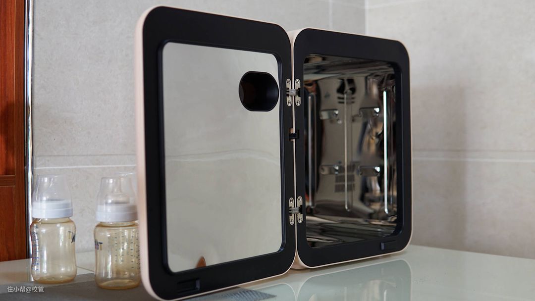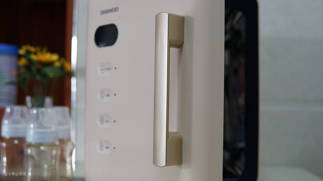 消毒柜的边角采用了圆润设计,没有突出的棱角,即使小宝宝碰到也没有什么问题。在消毒柜的左上方,有一个透明的可视工作窗口,方便观察里面的情况。