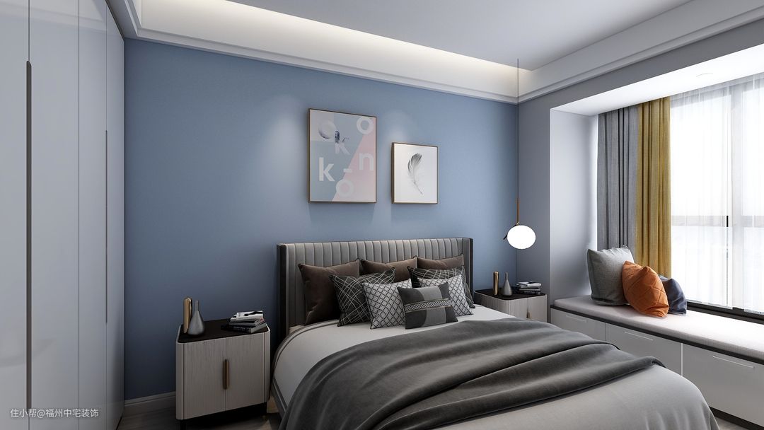 卧室背景墙刷成蓝色,挂上装饰画作为点缀