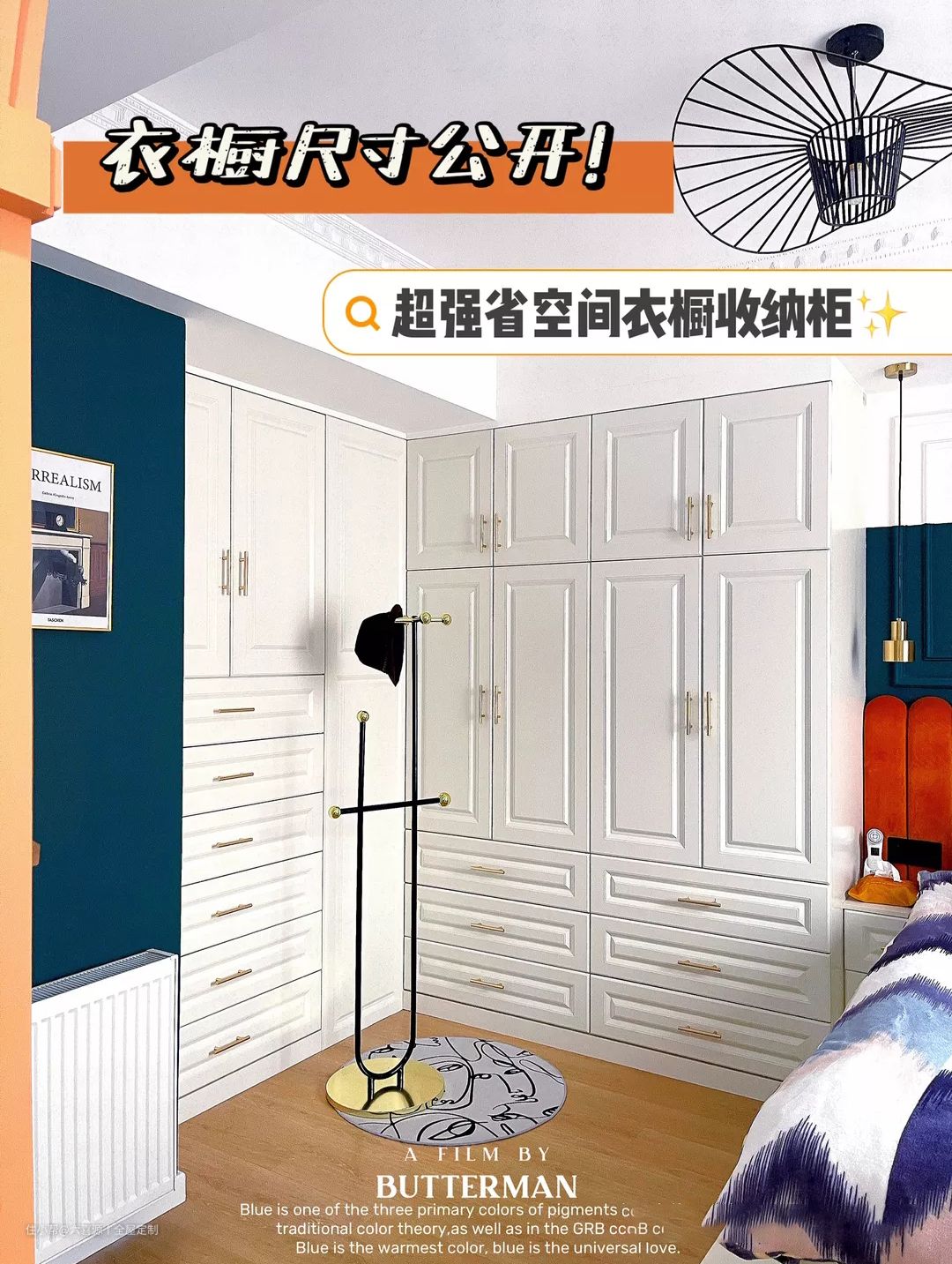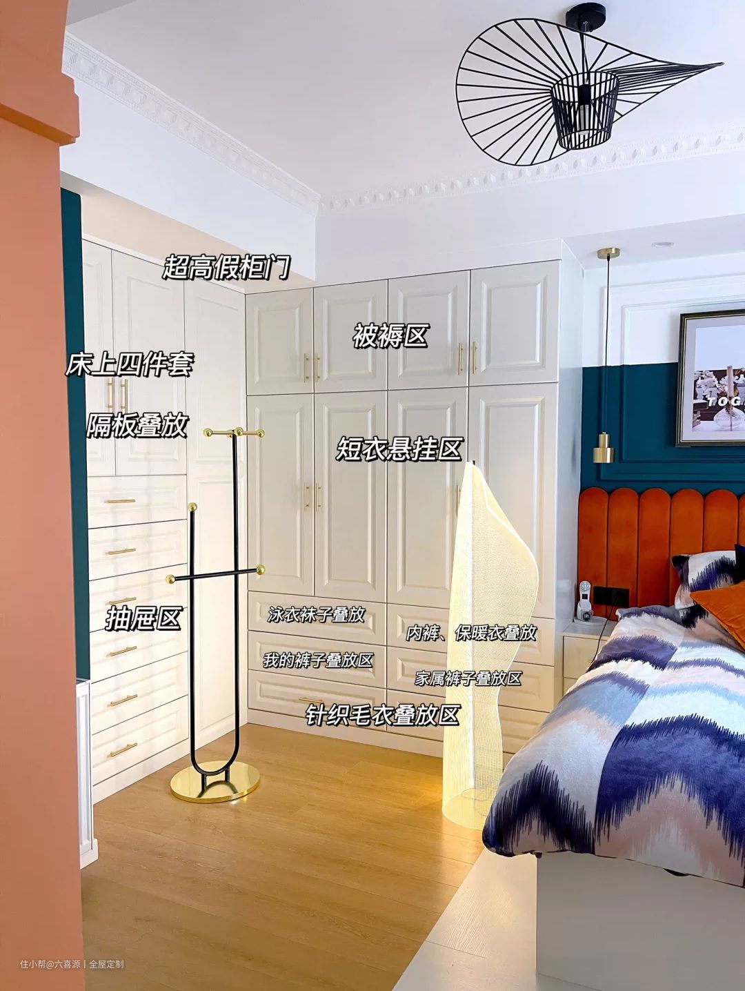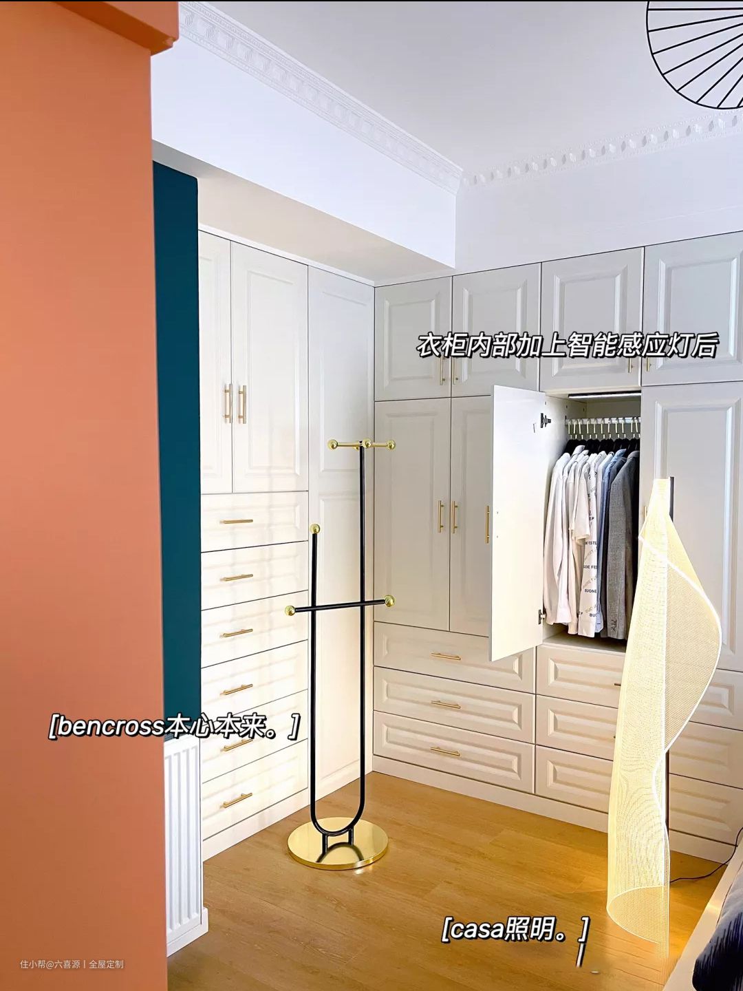 业主家主卧是原先的次卧改造而来,将走道和部分卫生间的面积纳入了主卧部分。整个房间和衣帽间与主卫生间形成了一个套房.主卧的衣柜最大限度地释放了活动区域,做成了L型嵌入式衣柜,与吊顶基本齐平。业主家柜子全部统一为对开门设计,既贴合了业主家全屋的对开门,在使用起来,对开门的衣柜门也比滑到式的平推门更实用,放置物品更方便,更轻松。主卧的衣柜设计了大量的挂衣区和抽屉区,解决了衣柜内层板太多,衣物堆放杂乱、经常找不到想要的衣服、卫生难以清扫的问题。