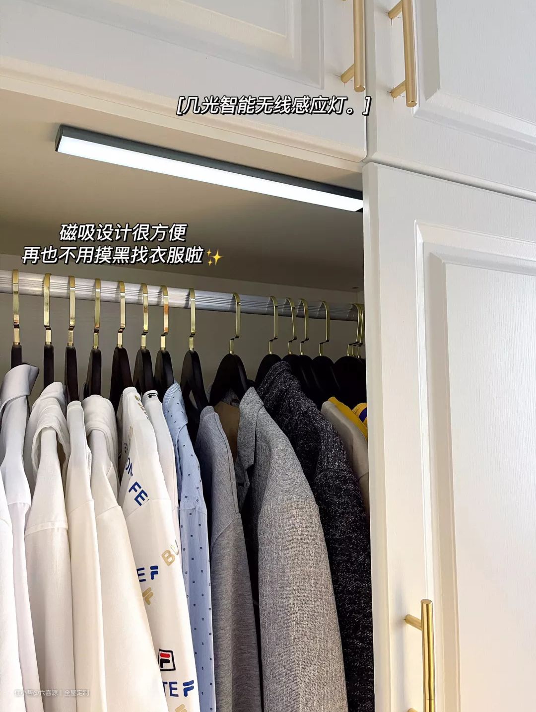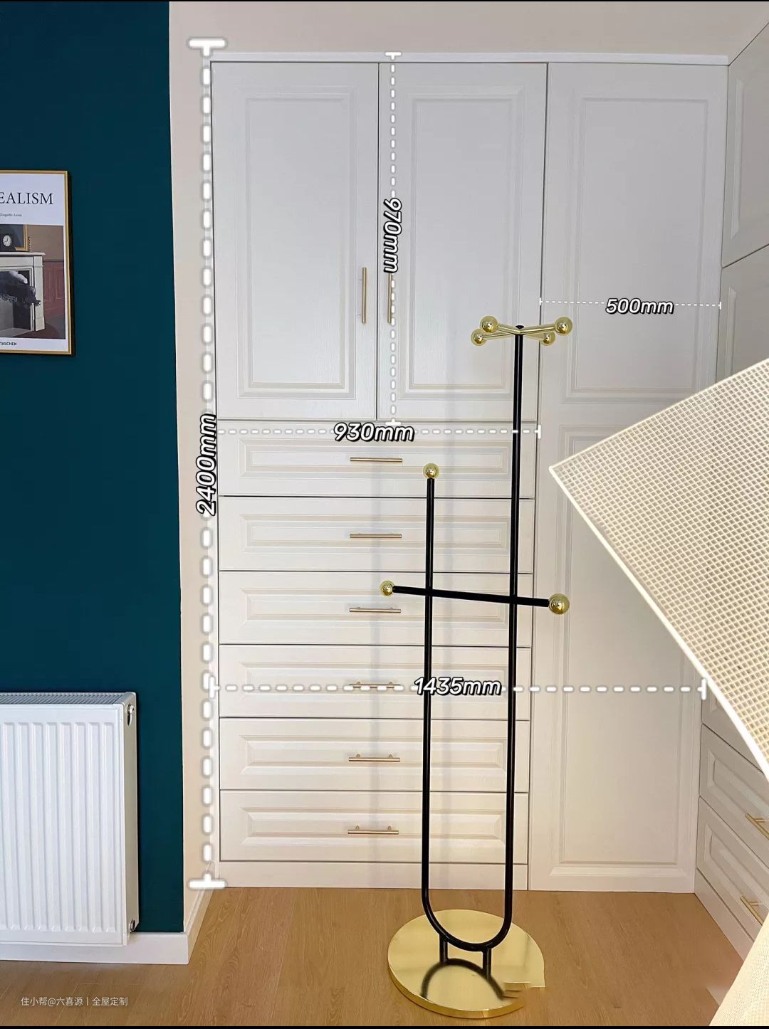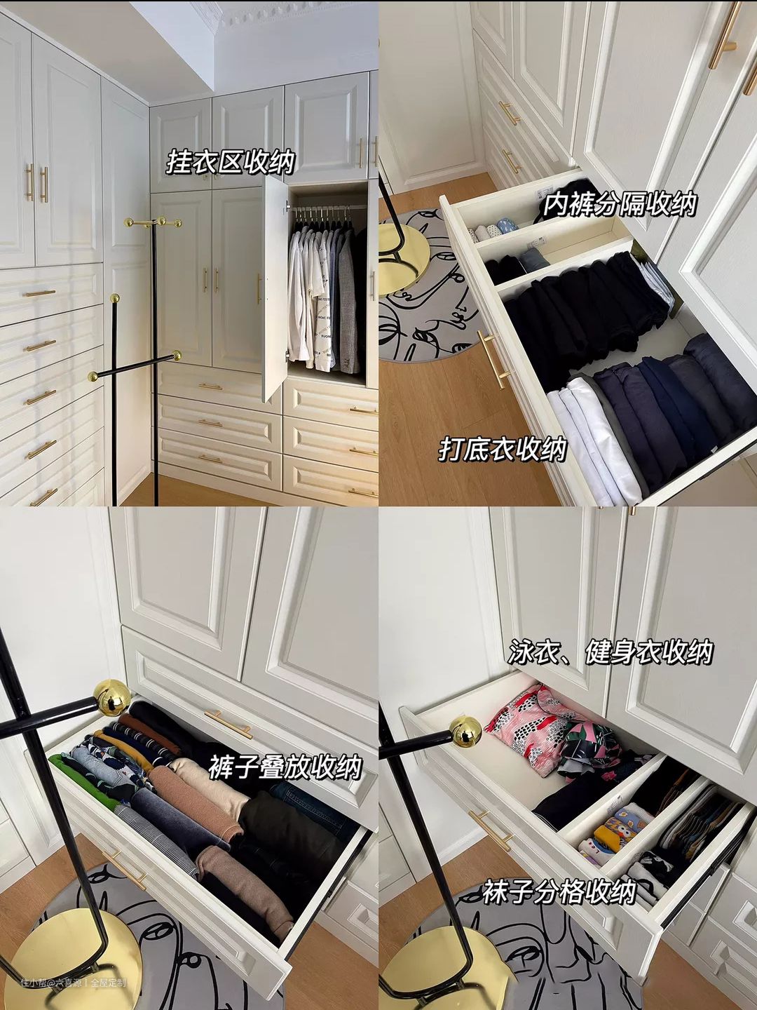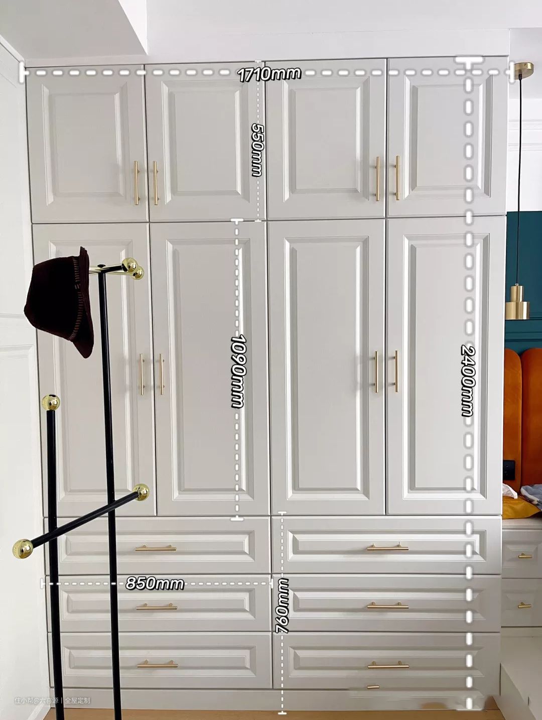业主家主卧是原先的次卧改造而来,将走道和部分卫生间的面积纳入了主卧部分。整个房间和衣帽间与主卫生间形成了一个套房.主卧的衣柜最大限度地释放了活动区域,做成了L型嵌入式衣柜,与吊顶基本齐平。业主家柜子全部统一为对开门设计,既贴合了业主家全屋的对开门,在使用起来,对开门的衣柜门也比滑到式的平推门更实用,放置物品更方便,更轻松。主卧的衣柜设计了大量的挂衣区和抽屉区,解决了衣柜内层板太多,衣物堆放杂乱、经常找不到想要的衣服、卫生难以清扫的问题。