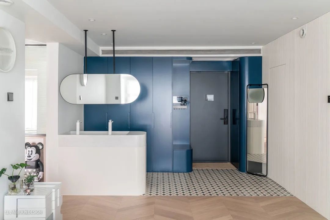 玄关以深蓝色为主,搭配拼花地砖,增添静谧感的同时又多了几分活泼气质。顶天立地的衣柜和鞋柜,采用圆角处理方式,消弭了直角尖锐感,让空间柔和舒适。左侧衣柜部分开放式设计,方便摆放随手物件,又留出换鞋凳的空间。